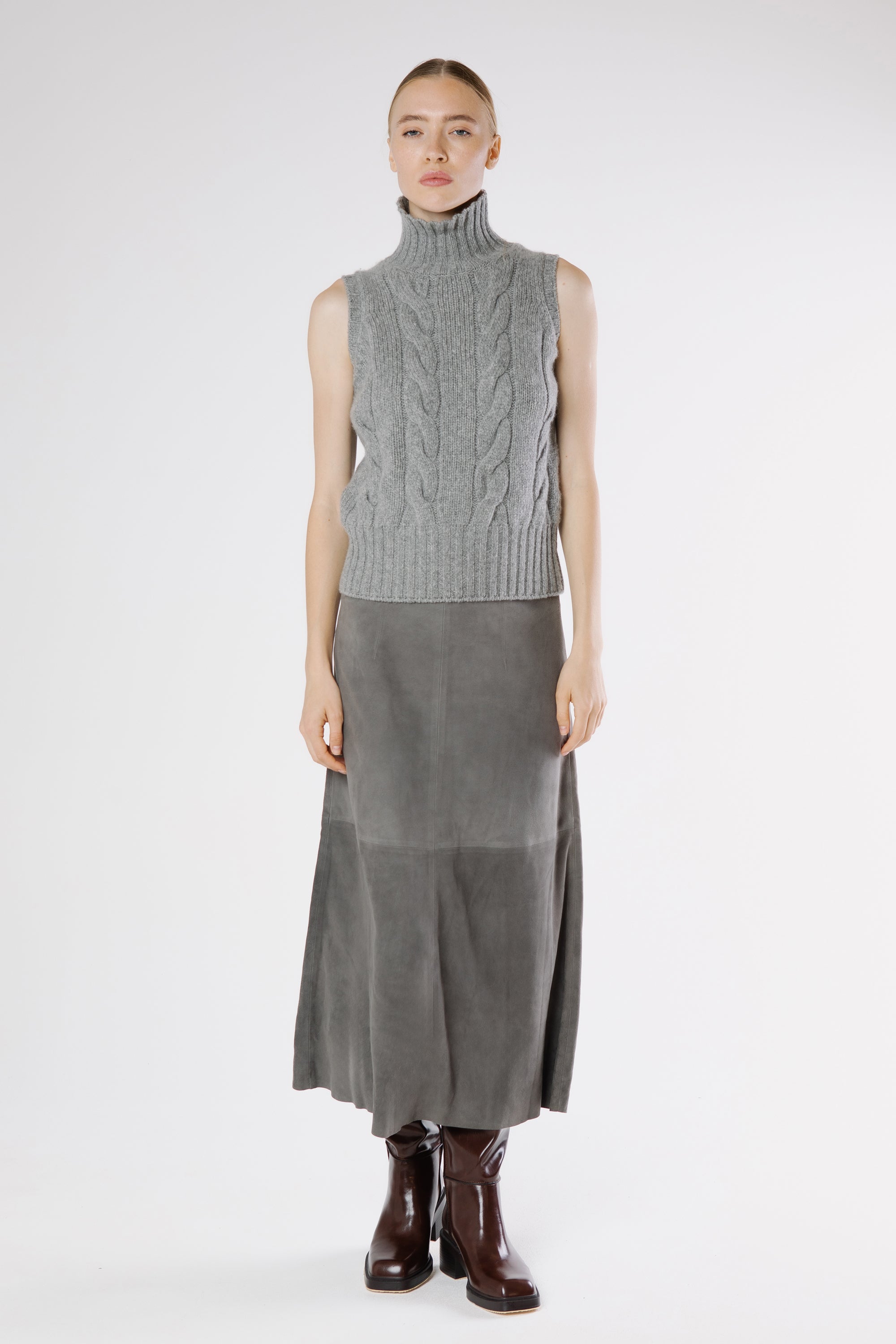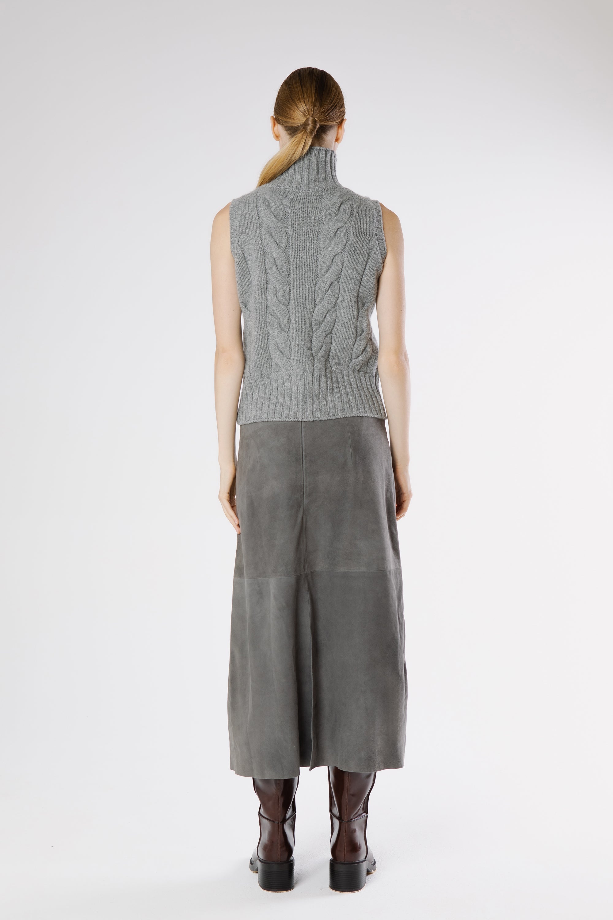 Crafted from pure Italian cashmere, it features a sleeveless design with a high ribbed turtleneck and chunky cable-knit texture.