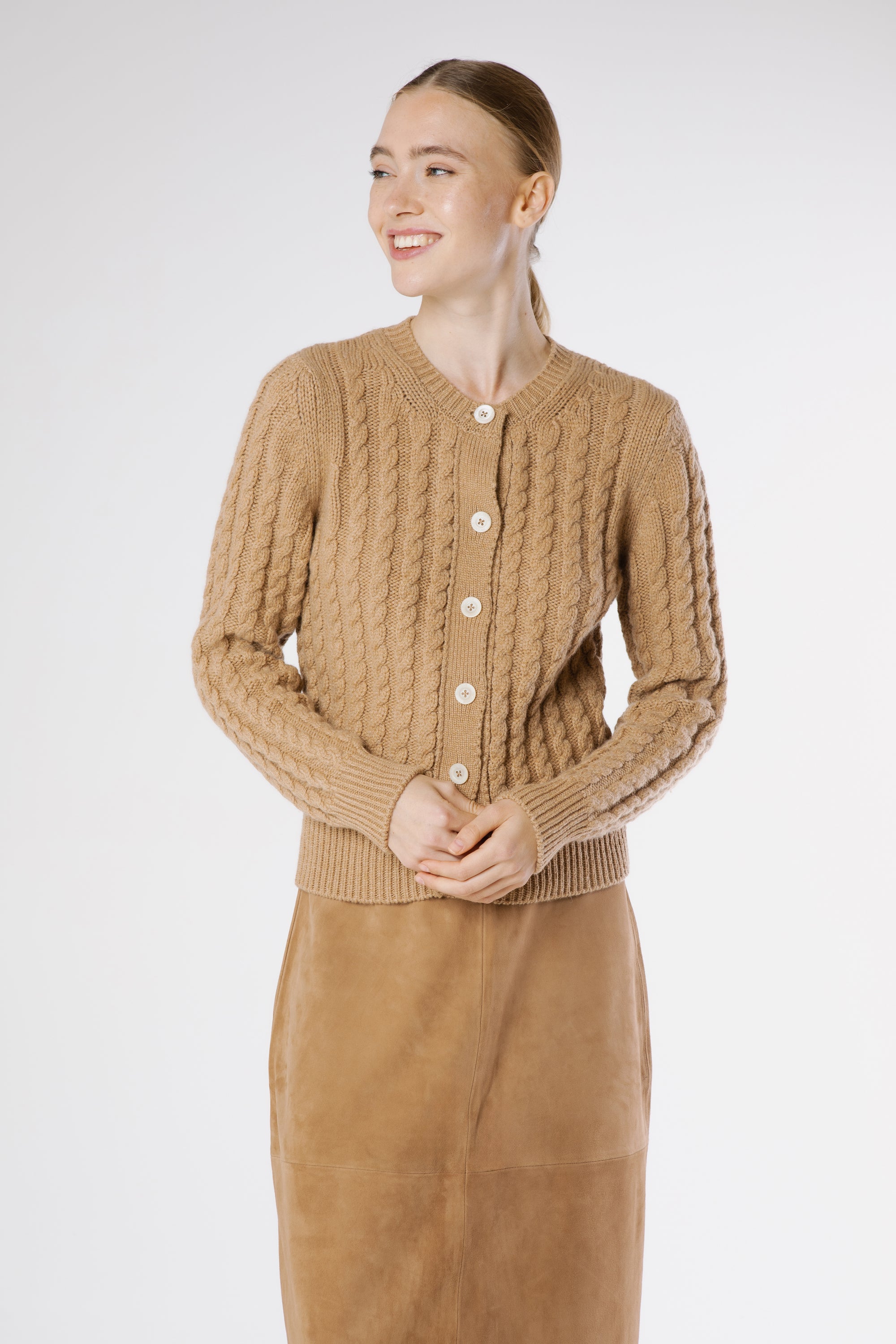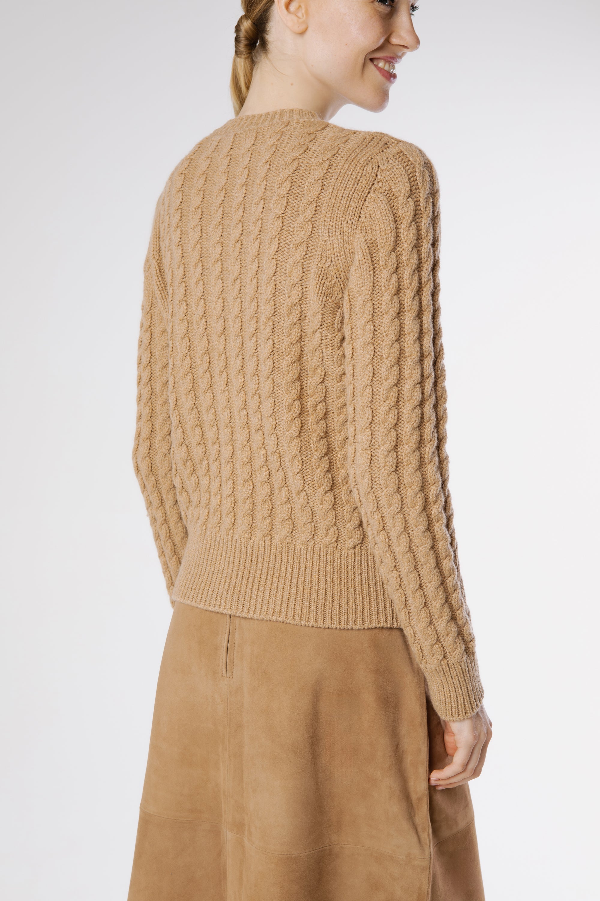 The Bella Cashmere Pullover in Rhum is a luxurious cable-knit sweater crafted from premium Italian cashmere.