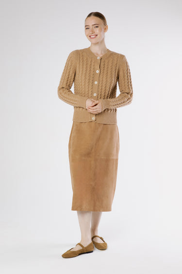 Its warm caramel tone, classic round neckline, and textured detailing offer an effortlessly elegant appearance.
