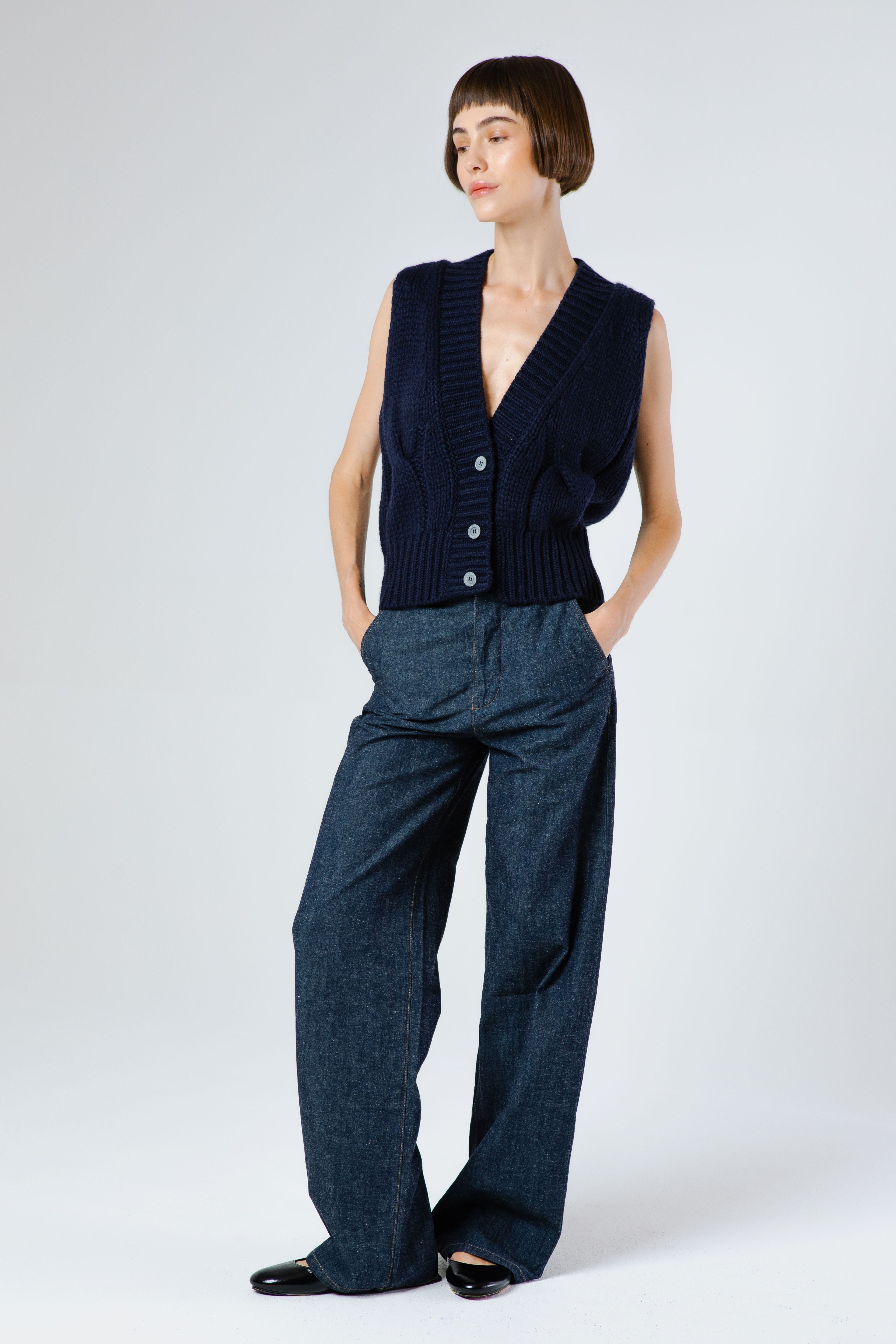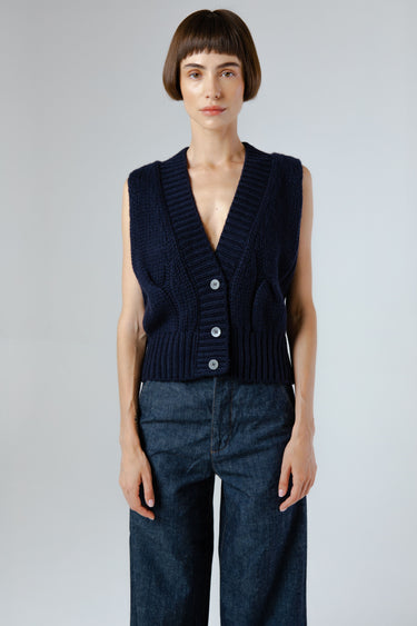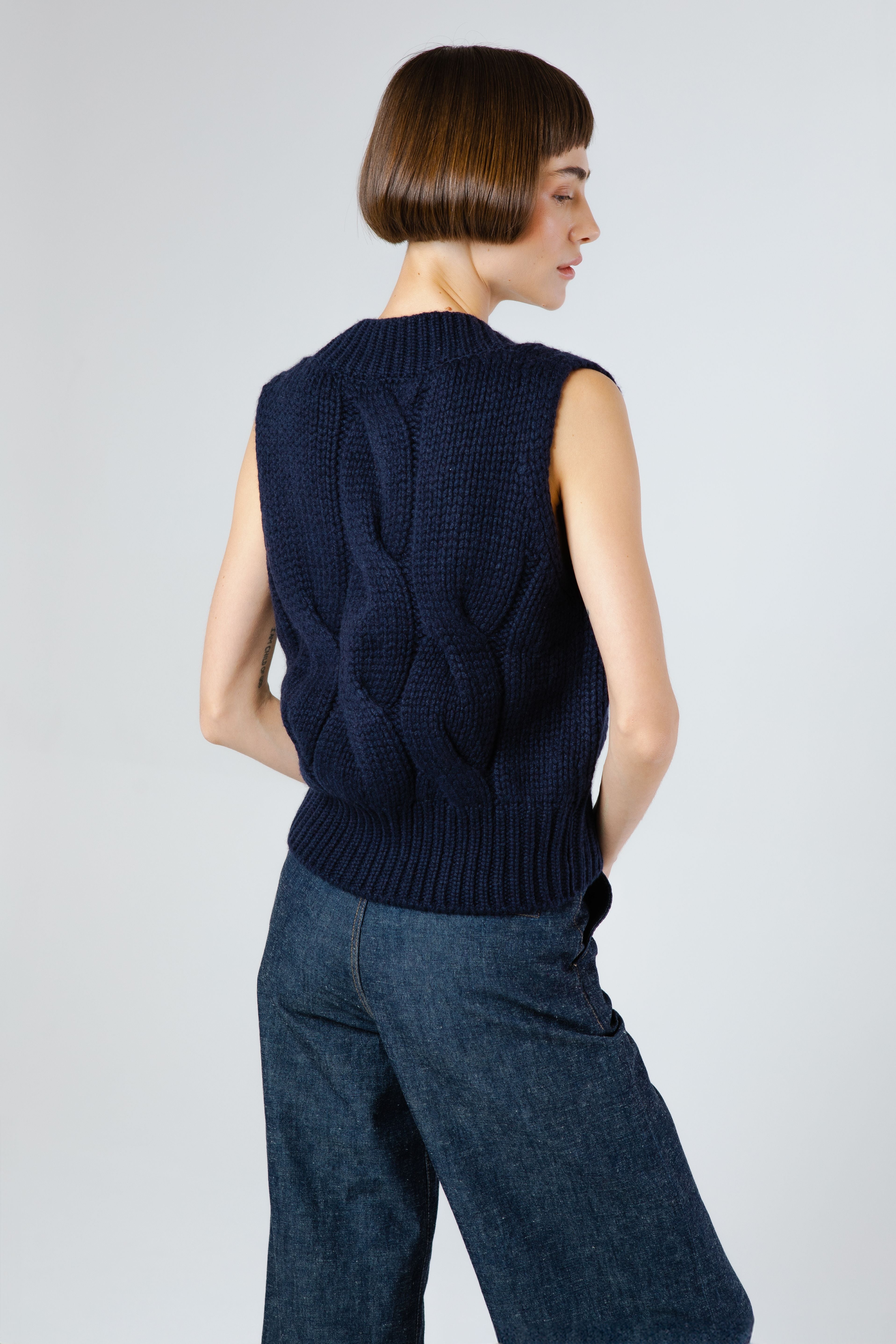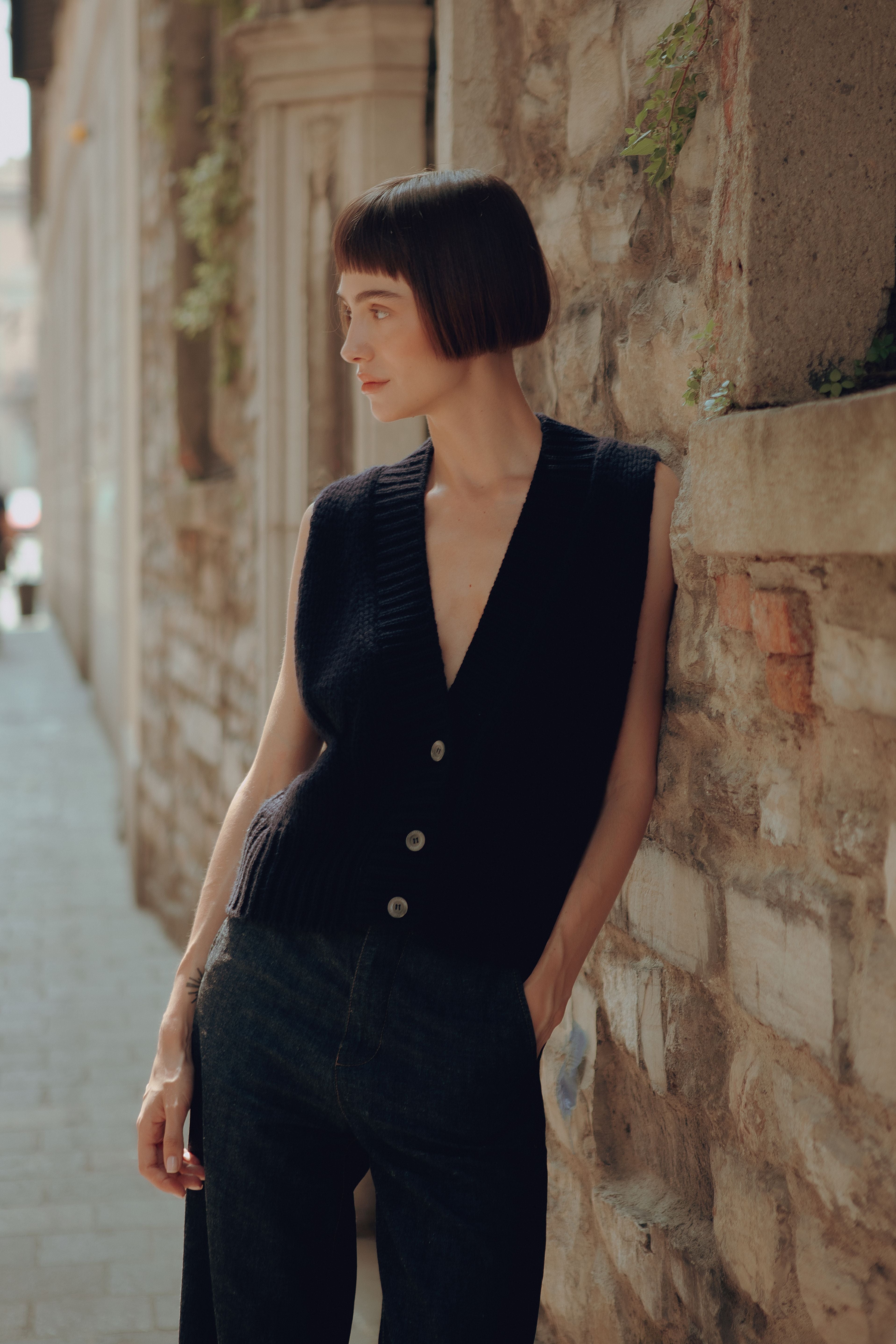 Crafted from ultra-soft, sustainable cashmere, it features a deep V-neckline, sculpted cable-knit structure, and elegant button closure. Its sleeveless design adds modern versatility — perfect for layering over shirts, blouses, or fine turtlenecks.