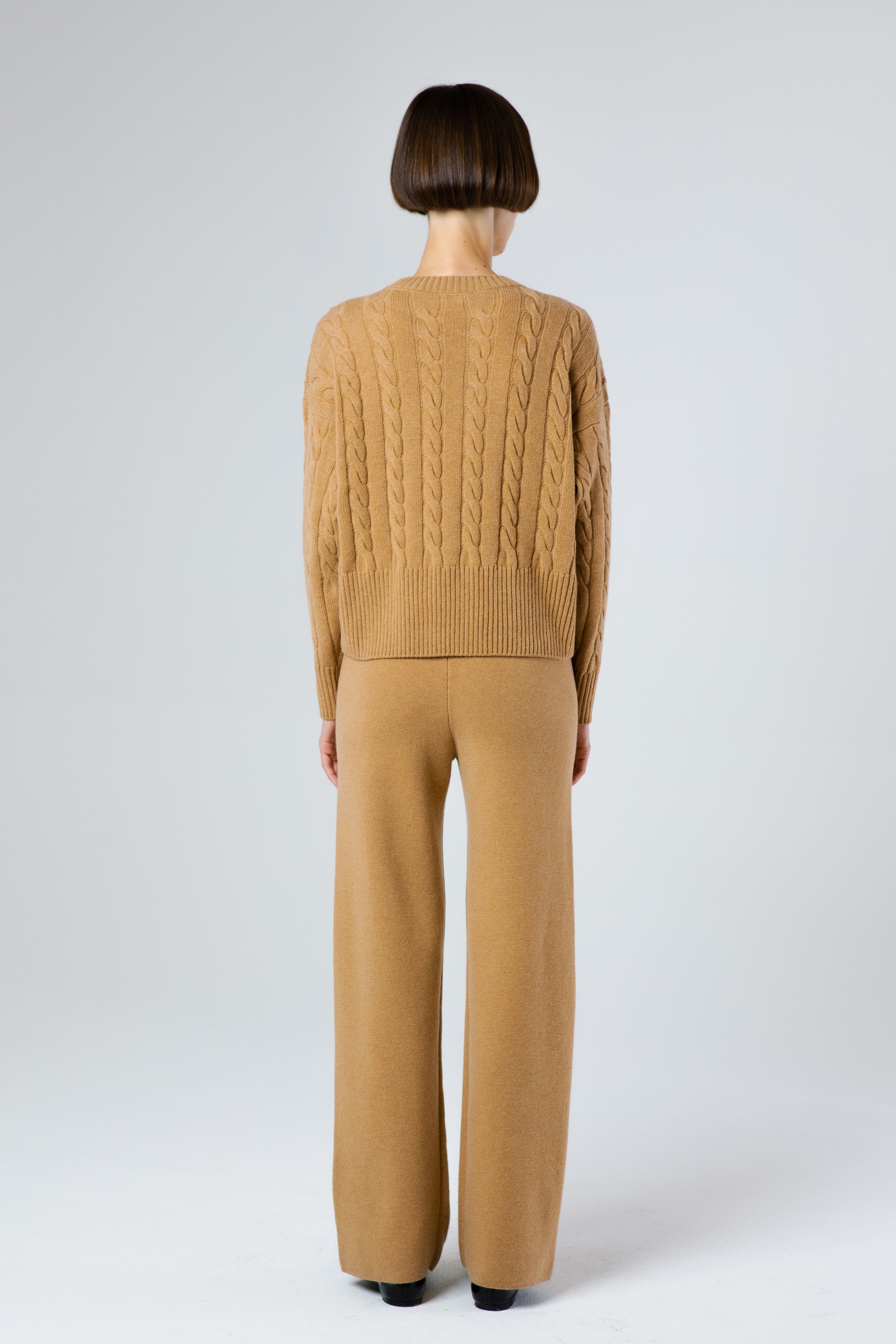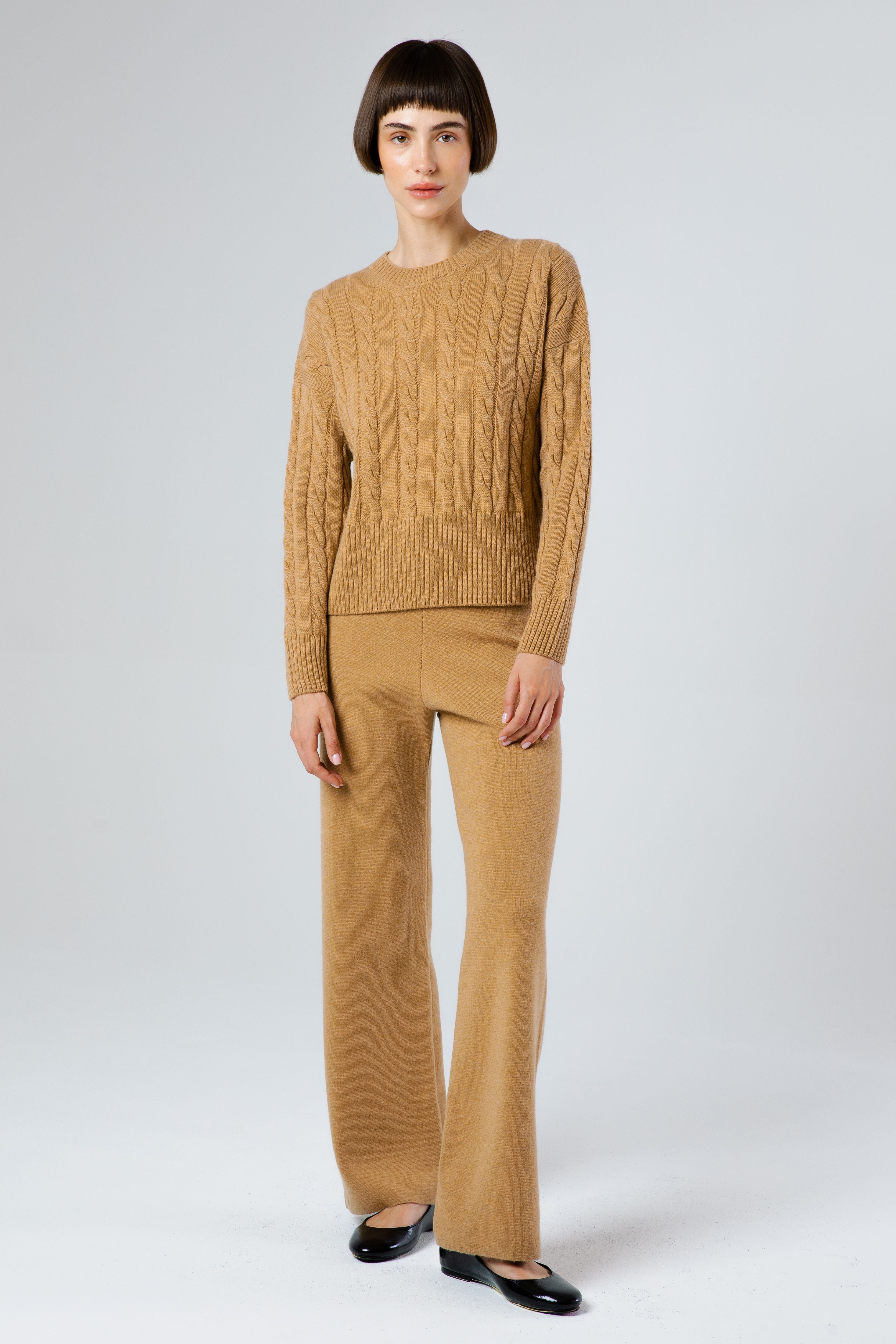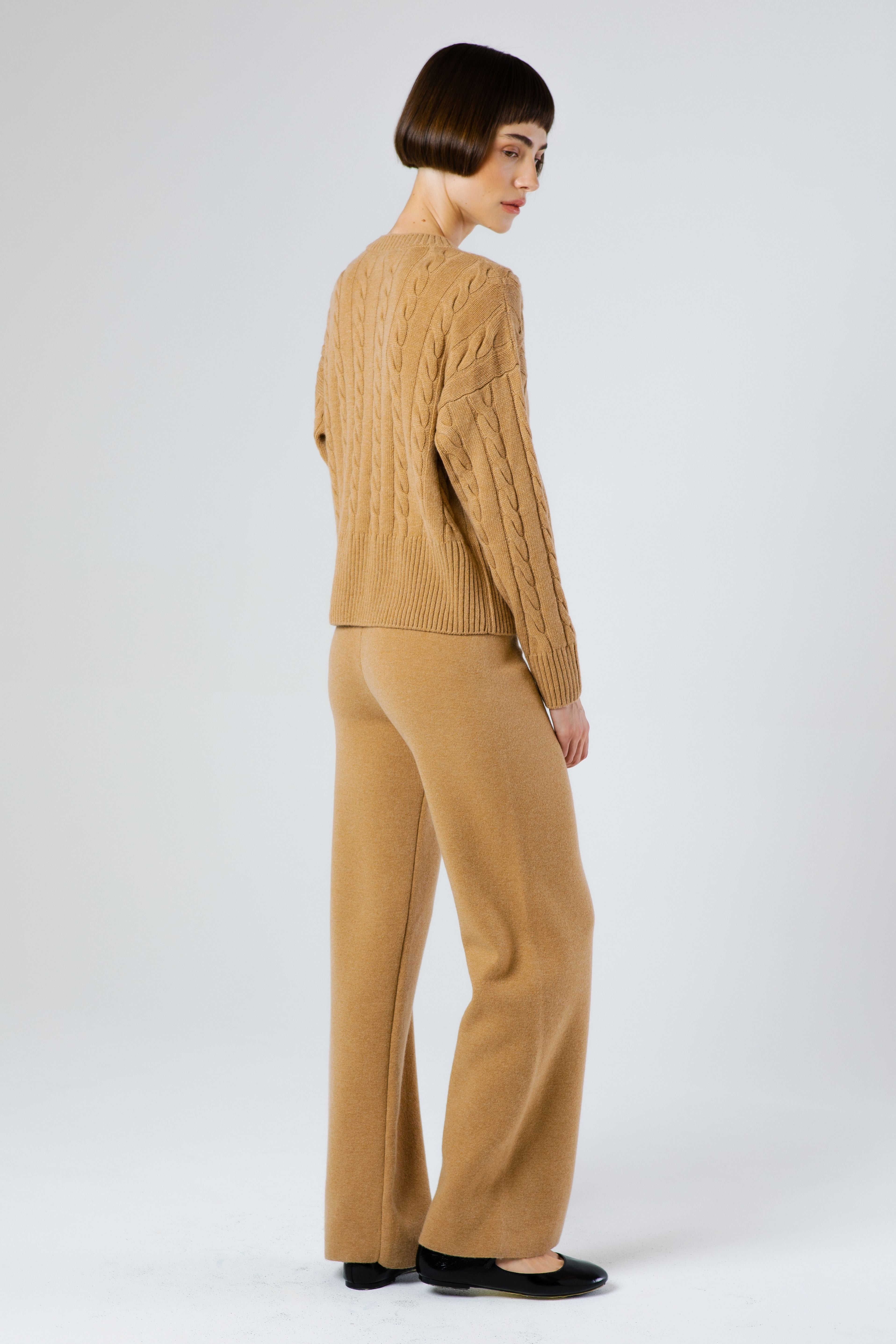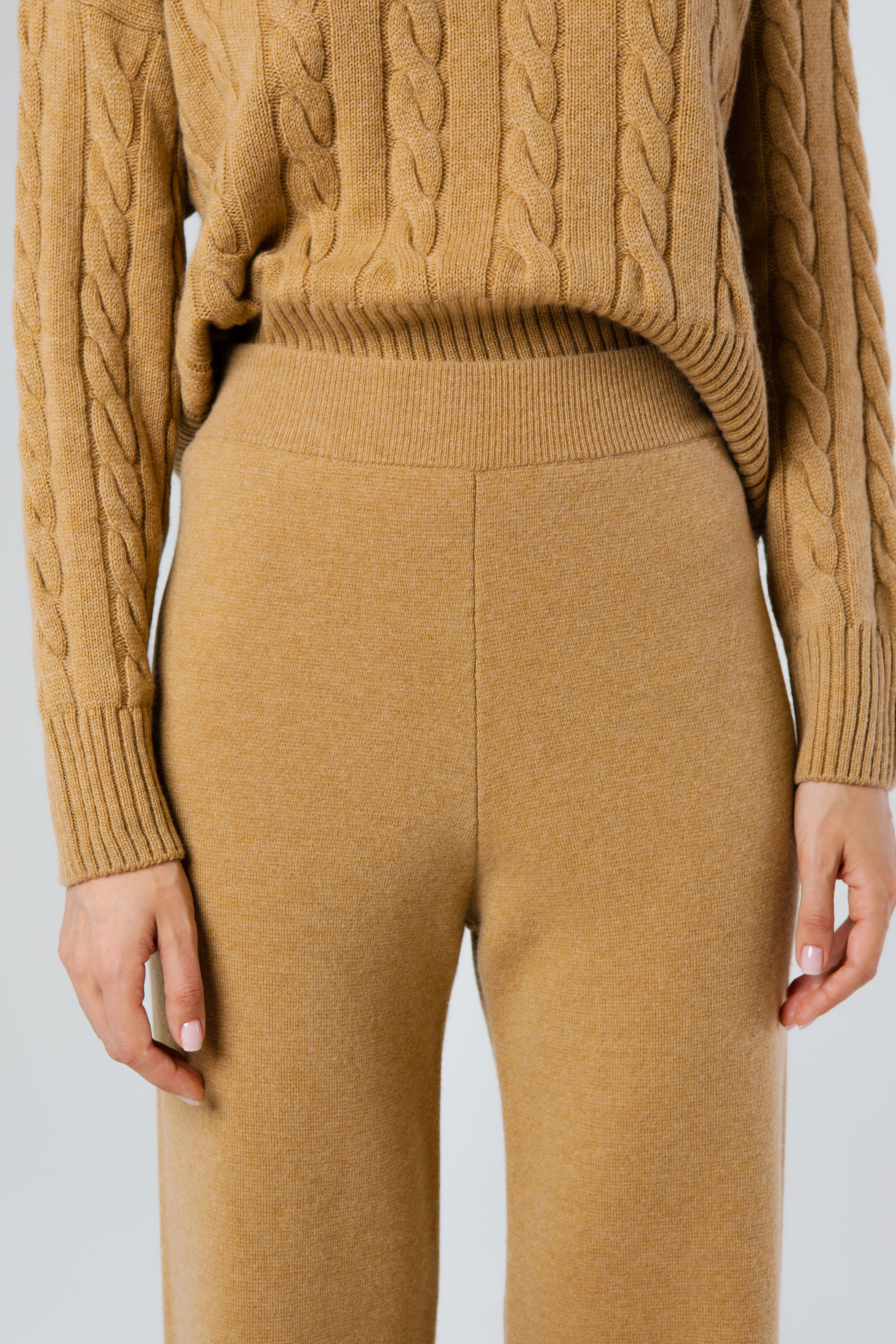 Expertly crafted in Italy from the finest sustainable cashmere, they feature a fluid, full-length silhouette with a soft elastic waistband and smooth finish. The natural camel tone enhances their timeless versatility — ideal for relaxed elegance at home or refined city dressing.